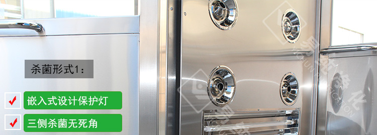 1、內(nèi)部安裝嵌入式紫外線殺菌燈,通過紫外波長為254微米的光波對室內(nèi)的微生物細菌進行殺菌,從而抑制細菌的增長和繁衍。由于紫外線對人體有一定的傷害,故人員在室內(nèi)的時候不適合殺菌,一般我們是采用定時裝置,在無人員的情況下進行殺菌。在控制系統(tǒng)里面安裝定時計時裝置,自動啟動殺菌系統(tǒng)。
