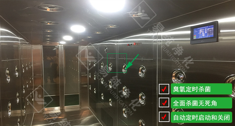 2、內(nèi)置微型臭氧滅菌:由于紫外線殺菌有一定的局限性及死角,其風淋靜壓廂內(nèi)部的殺菌效果較差,我們在風淋內(nèi)部嵌入了微型臭氧發(fā)生器,同樣采用在控制系統(tǒng)里面安裝定時計時裝置,自動啟動殺菌系統(tǒng)。